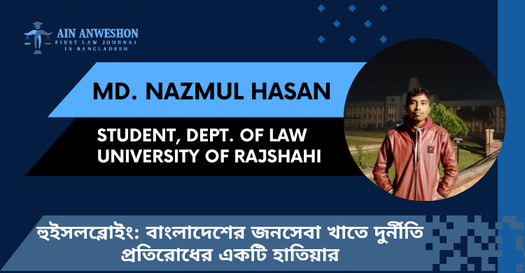 সারসংক্ষেপ (Abstract): বাংলাদেশের জনসেবা খাতে দুর্নীতি একটি দীর্ঘস্থায়ী ও চ্যালেঞ্জিং সমস্যা। হুইসলব্লোইং একটি কার্যকর মাধ্যম হিসেবে বিবেচিত হচ্ছে যা অভ্যন্তরীণ তথ্য প্রকাশের মাধ্যমে দুর্নীতি উন্মোচনে সহায়তা করে। এই প্রবন্ধে হুইসলব্লোইং-এর ধারণা, আইনি কাঠামো, কার্যকারিতা, এবং বাংলাদেশে এর বাস্তব প্রয়োগ ও চ্যালেঞ্জসমূহ বিশ্লেষণ করা হয়েছে। ভূমিকা হুইসলব্লোইং (Whistleblowing) বা দুর্নীতির বিরুদ্ধে অভ্যন্তরীণ সূত্র থেকে তথ্য প্রকাশ […]